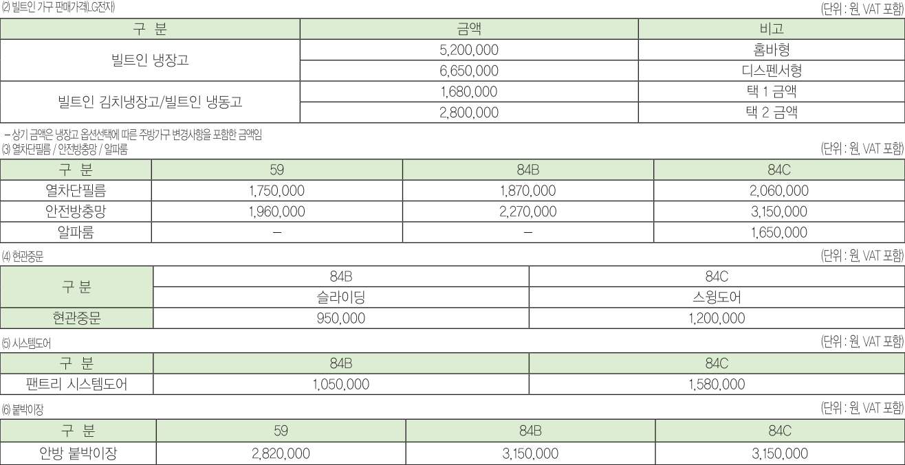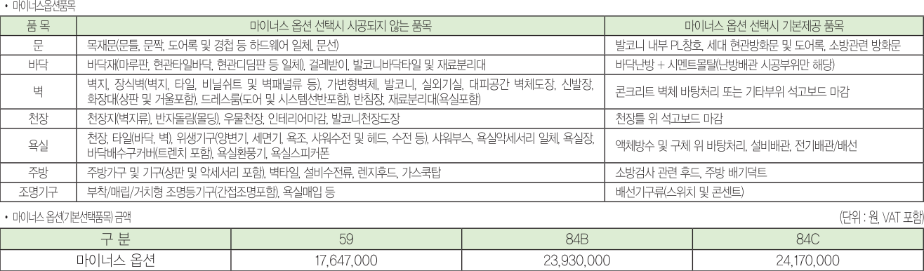 확장비는 무상이며 분양가 외에 스템에어컨, 인테리어, 가전 옵션, 마이너스옵션이 있습니다.