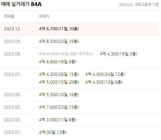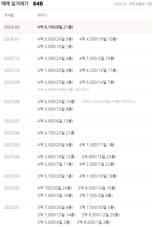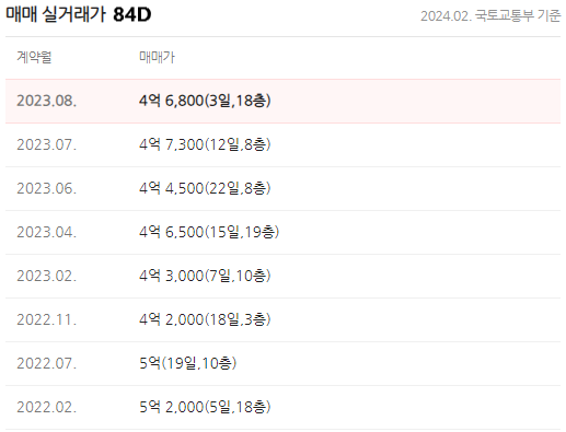 84B타입이 거래가 많습니다. 일반적으로 타워형보다 판상형이 인기가 많은데, 이안동대구의 84B타입은 타워형이지만 3베이 판상형의 형태를 가지고 있습니다. 게다가 남향에 가까운 남서향이라 인기가 많은 것 같습니다. 2021년 말부터 시작된 대구의 긴 하락기로 2023년 초에는 3억 중후반의 거래가 많았는데, 최근 3개월 거래를 보면 4억 초반~후반까지 안정적으로 거래되며 소폭 회복한 모습을 보이고 있습니다.