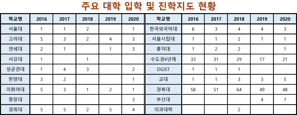 ※2023년 경북여고 입결: 의대 2명, 한의대 3명, 약대 3명, 서울대 2명, 연세대 3명, 고려대 1명, 서울·수도권 44명, 교대 7명, 경북대 34명, 부산대 5명 등