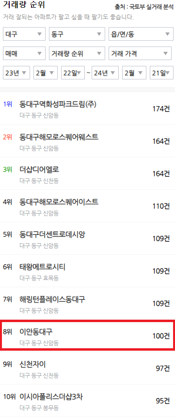 조회수와 거래량이 동구 내에서 상위에 랭크되어 있습니다. 최근 1년 거래량이 100건에 달할 정도로 관심과 수요가 많은 아파트입니다. 인기가 많더라도 거래량이 받쳐주지 못한다면 그 아파트의 가치가 높다 할 수 없을 것입니다.