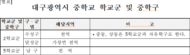 -중학교: 수성구 중동에서는 대부분 황금중, 신명여중으로 배정됩니다. 지원하기에 따라 동도중, 경신중, 대륜중, 능인중, 정화중, 대구동중, 덕화중으로도 일부 배정되고 있습니다. 수성구 중동은 5학교군(남구)과 자유학구로 수성구 외에도 남구에 있는 중학교로 지원이 가능합니다.