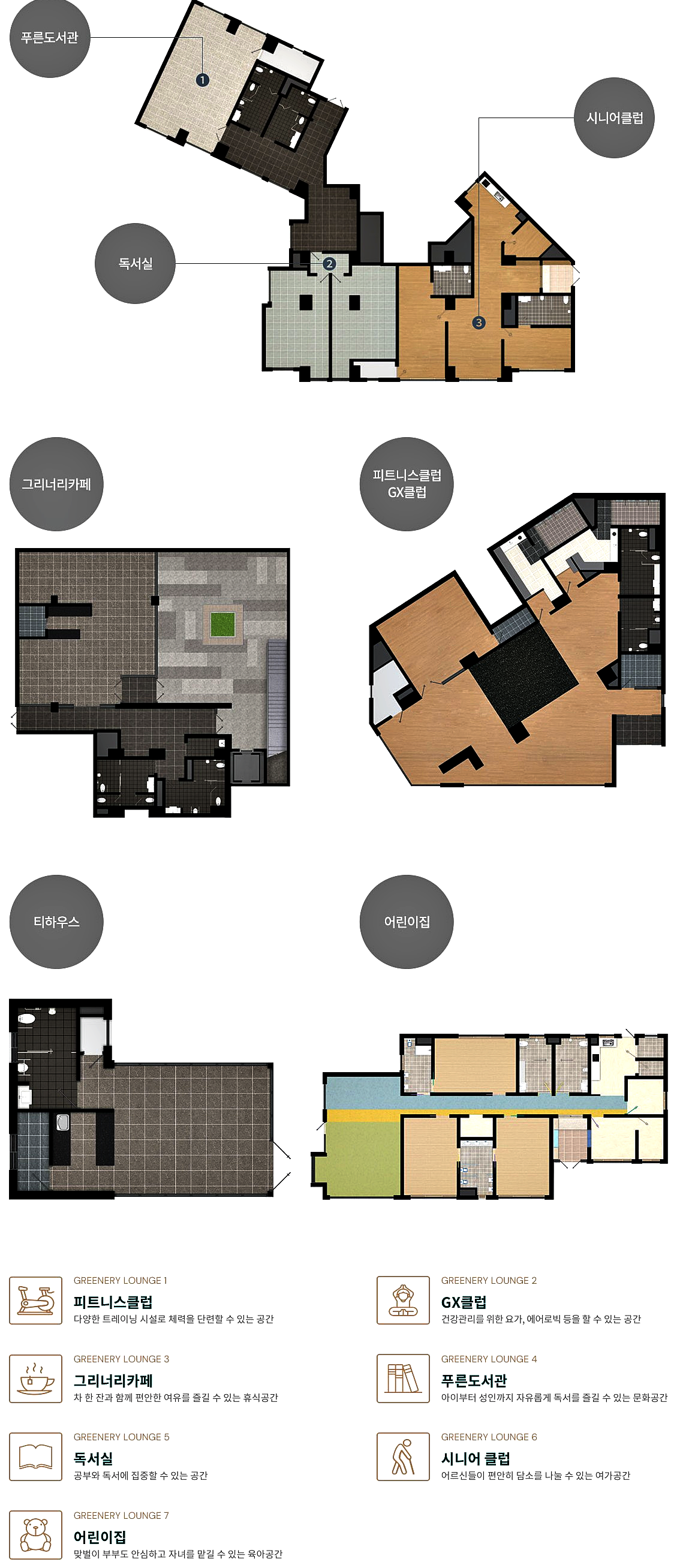 주민 편의시설(커뮤니티)로 헬스장, GX룸, 푸른도서관, 독서실, 그리너리카페, 티하우스, 국공립 어린이집 등이 있습니다. 헬스장과 GX룸은 107동 1층, 독서실과 푸른도서관은 102동 1층, 그리너리카페는 108동 지하 1층, 티하우스는 107동 앞에 있습니다.