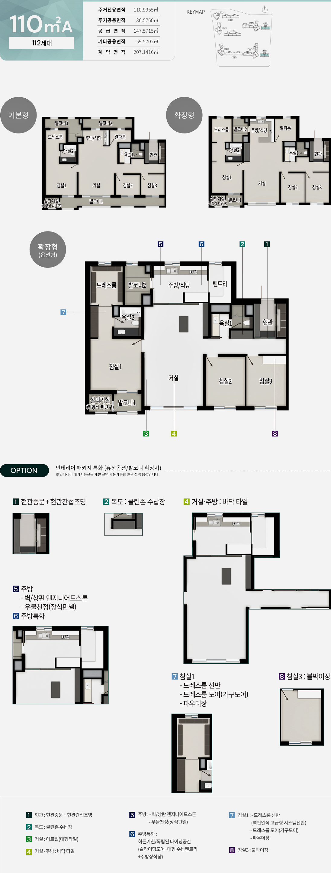 국평과 대형으로만 이루어진 중대형 단지입니다. 84A, 110A, 110D타입이 4베이 판상형이고 나머지 타입은 모두 타워형입니다. 판상형은 기본적으로 드레스룸과 안방, 부엌과 거실의 맞통풍이 가능한 구조이며 옵션 유무에 따라 알파룸과 작은방의 맞통풍도 가능합니다. 실외기실에는 하향식 피난구가 설치되어 있습니다.