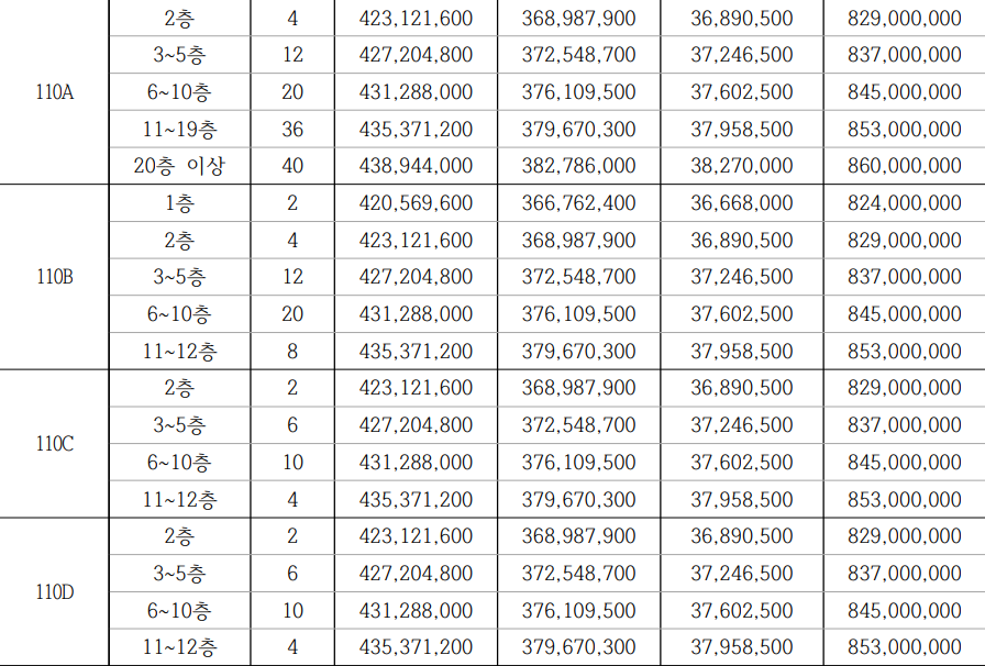 110D - 분양가 829,000,000~853,000,000원 + 확장비 40,000,000원