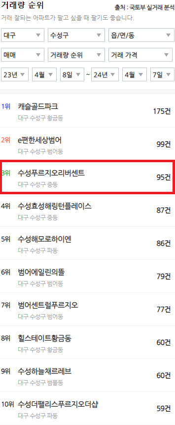 조회수를 보면 수성구 내에서 준수한 선호도를 보이고 있습니다. 최근 1년 거래량은 약 100건에 가까운 많은 거래량을 보이며 수성구의 여러 인기 단지들과 함께 어깨를 나란히 하고 있습니다. 객관적인 데이터를 통해 거주지로서 장점이 많다는 것을 알 수 있습니다.