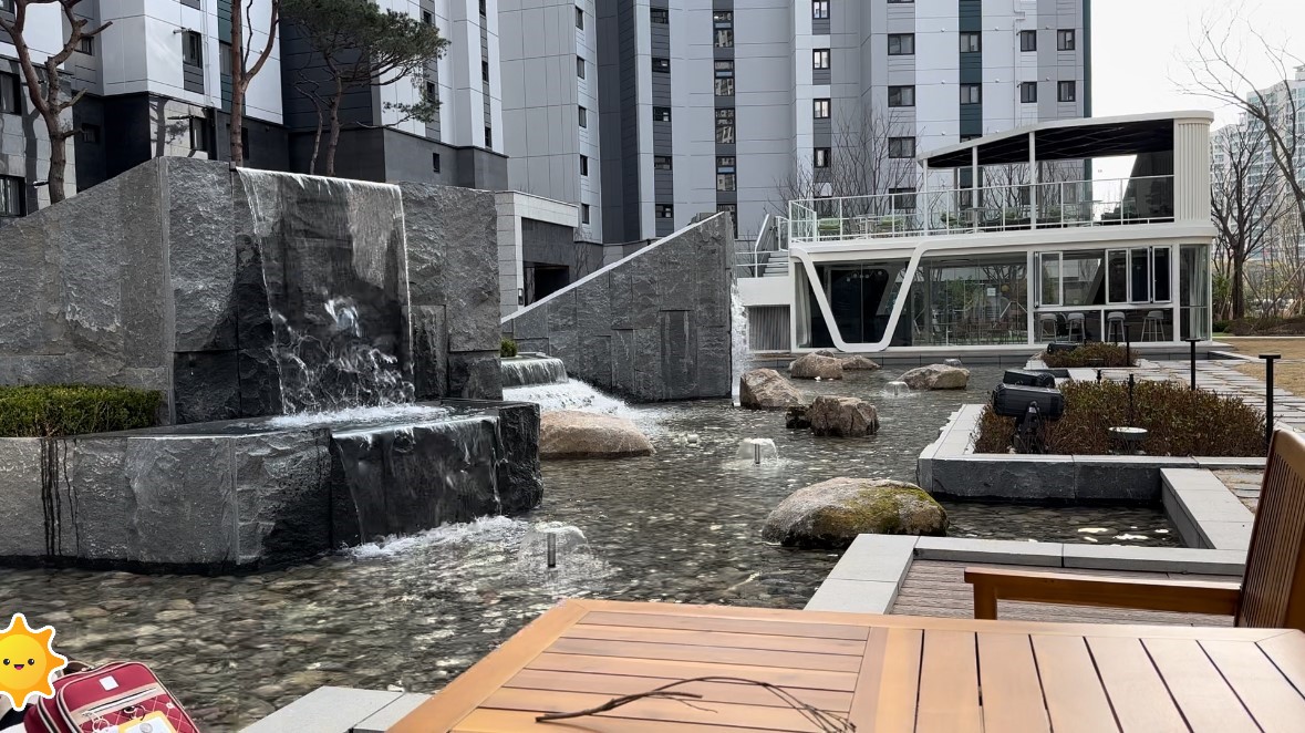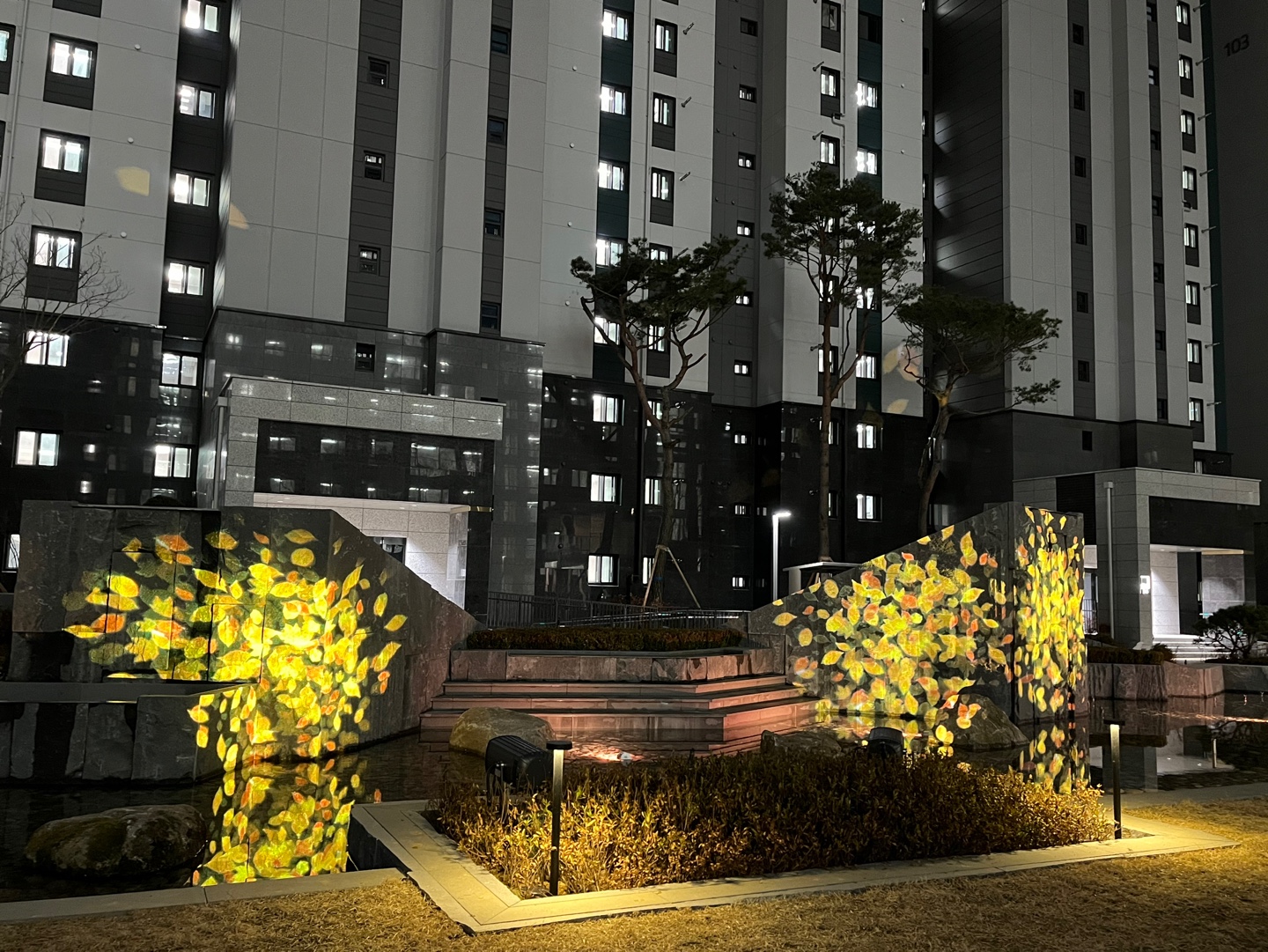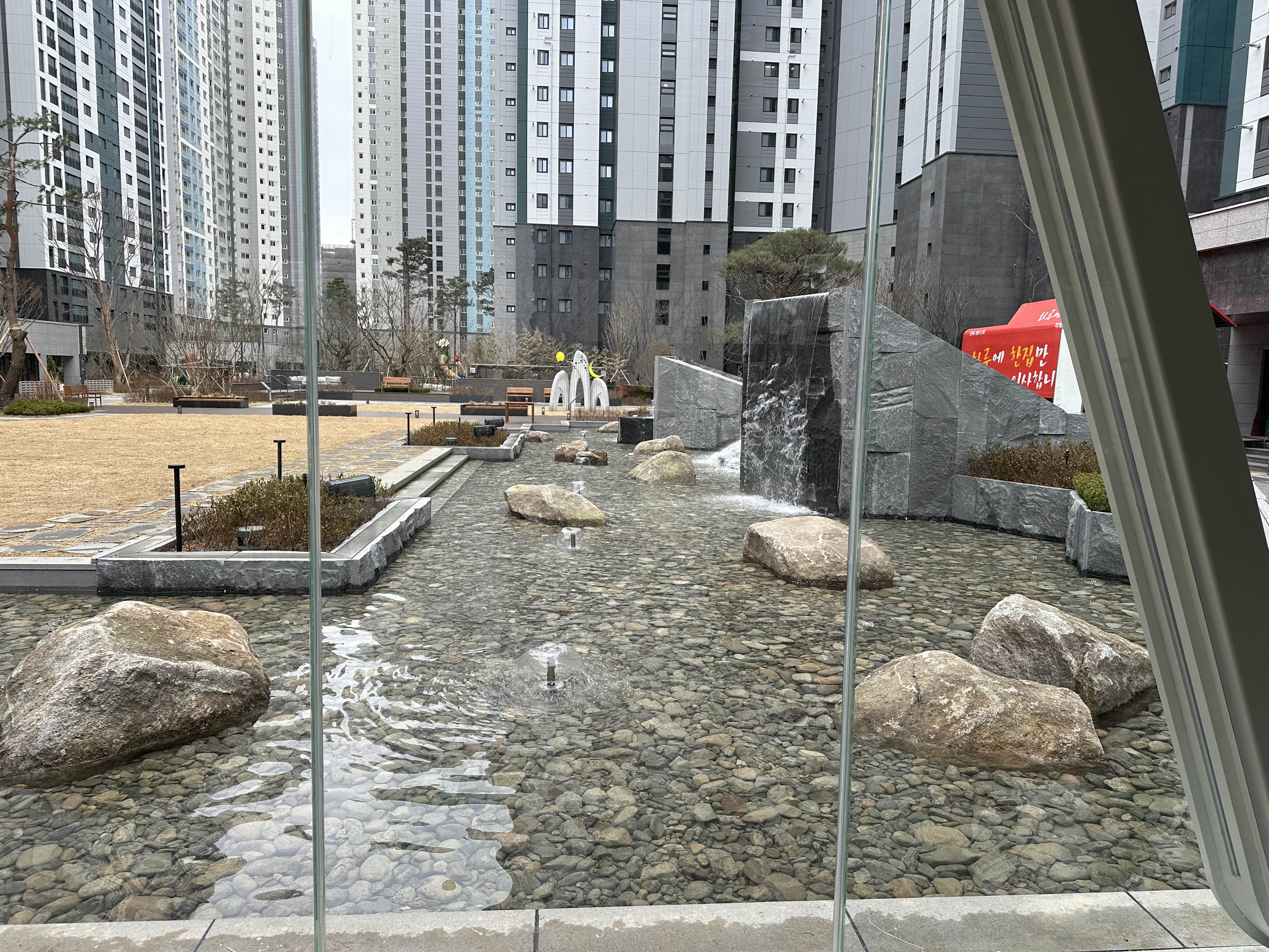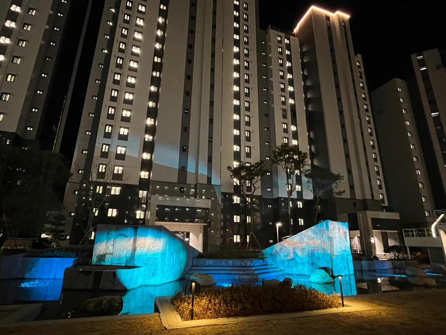 105동의 경우 정면의 중앙광장에 석가산 특화가 적용되어 세대에서 리조트에 온 느낌을 받을 수 있습니다. 일반적인 석가산과 다르게 푸르지오에서 디자인상을 받은 트렌디한 석가산입니다. 야간에는 GOBO조명을 통해 몽환적인 모습이 연출됩니다. 신천뷰가 나오는 로얄동이 아니라면 105동의 정원뷰도 좋아 보입니다.