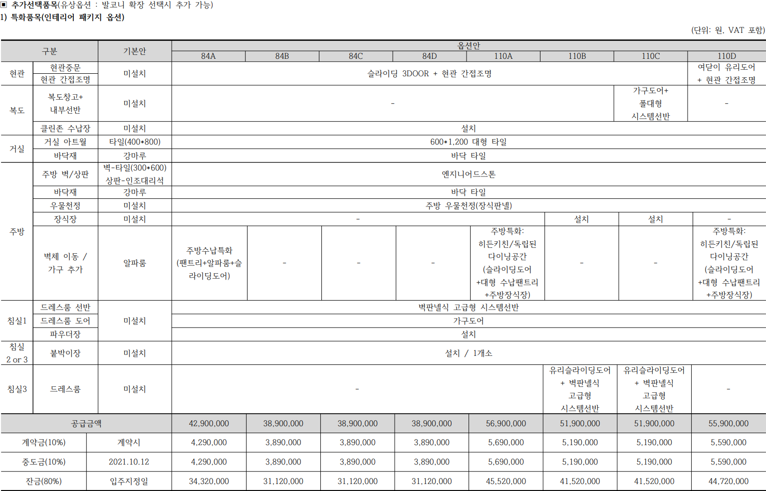 분양가, 확장비 외에 시스템에어컨, 가전, 인테리어 옵션 등이 있습니다.