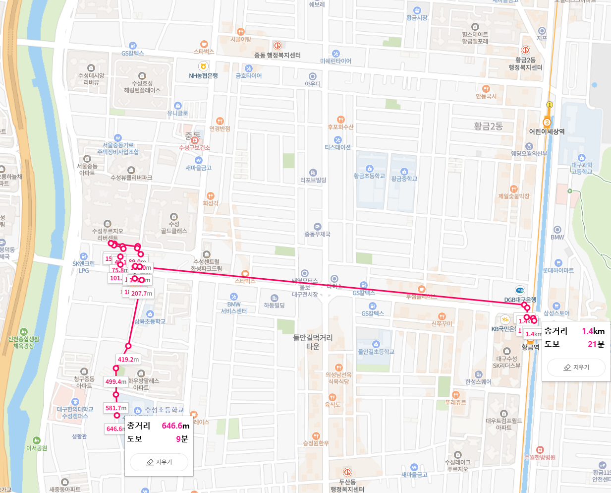 수성구청역 학원가까지 거리는 약 4km로 비교적 가까운 편이며 자차로 약 10분, 버스로 약 20분 정도면 갈 수 있습니다. 수성구 학군은 학원이 상당히 큰 부분을 차지하는데, 학원가의 접근성이 양호한 부분은 수성푸르지오리버센트의 큰 장점 중 하나가 되겠습니다.