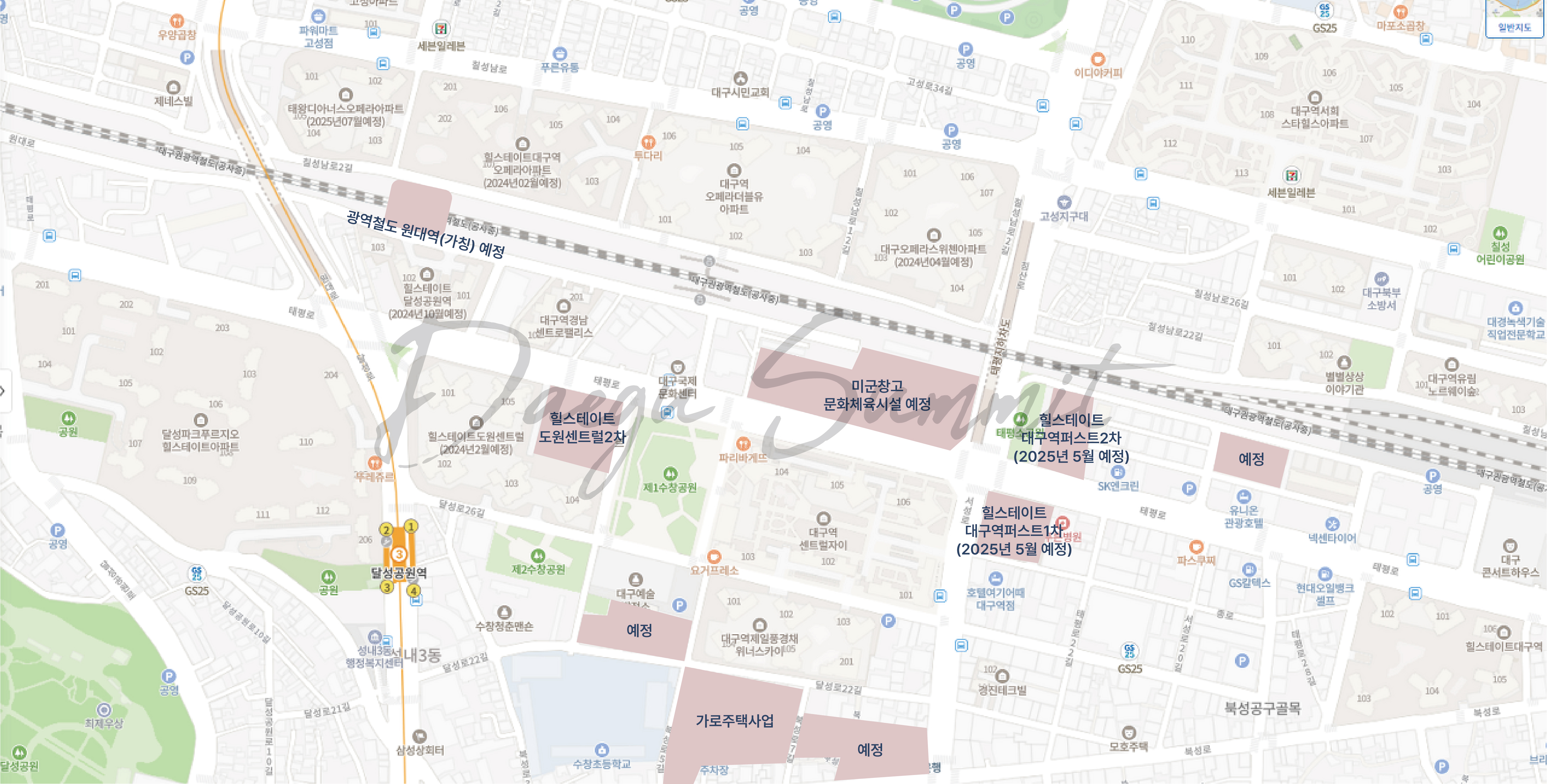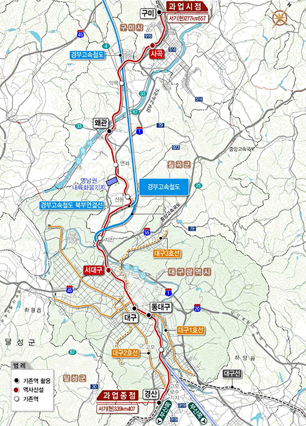 대구역과 종로역이 도보 5분 거리에 있어 지하철과 기차를 편리하게 이용할 수 있습니다. 그리고 구미~칠곡~대구~경산 생활권을 잇는 대구권 광역철도가 2024년 말 개통 예정이라 교통이 한층 더 좋아질 것 같습니다. 노선은 아래를 참고하세요.