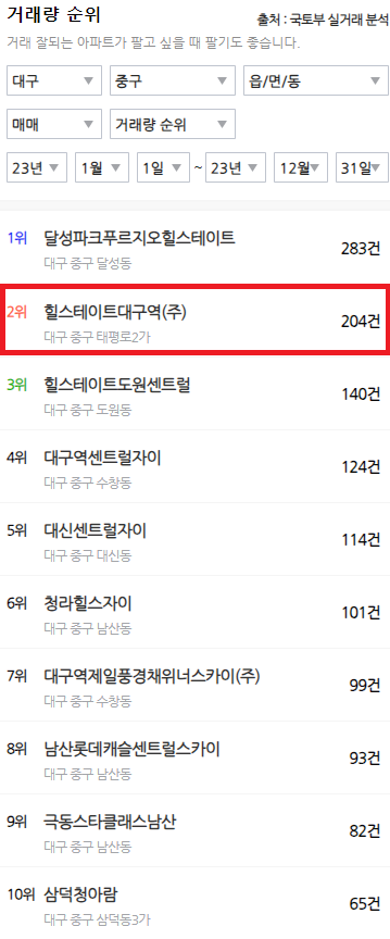 중구 내에서 인기도와 거래량이 상위에 랭크되어 있습니다. 인기도에 비례하여 거래량까지 받쳐주는 좋은 아파트입니다. 태평로 대장이라는 별명이 괜히 생긴 게 아닌 것 같습니다.