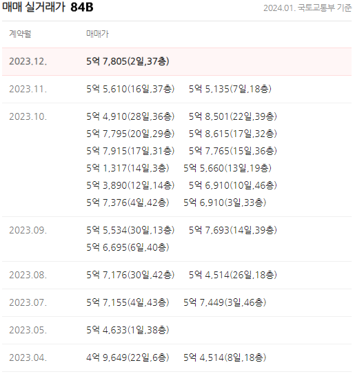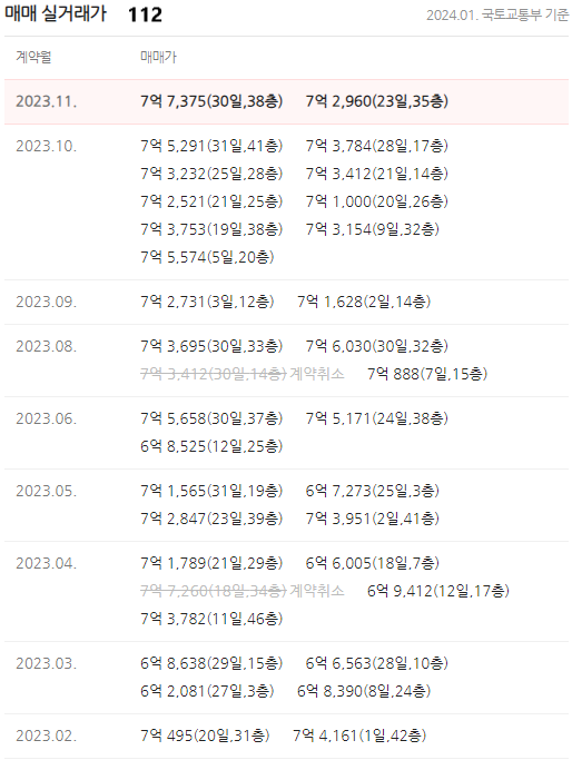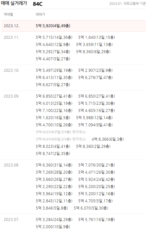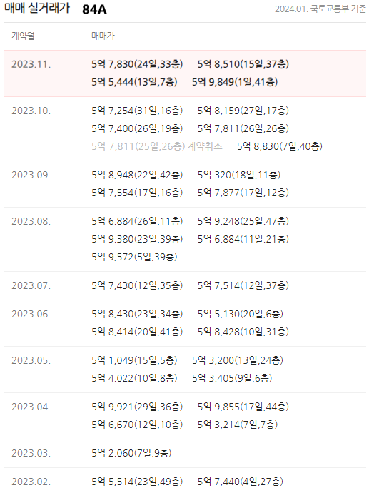 주력 모델인 84C타입이 거래가 많습니다. 2021년 말부터 시작된 하락장이 현재도 이어지고 있어, 분양가 이하(마이너스 프리미엄) 또는 분양가로 거래가 많았습니다. 현재는 입주장인데 매물이 소화되지 못하고 많은 상태입니다. 태평로 라인이 대대적인 개발 중이라 주변에 매물도 많고, 입주 예정인 단지가 줄지어 있어 소화되는데 시간이 필요해 보입니다.