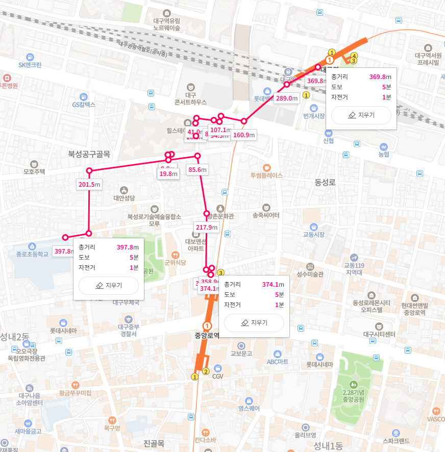 -편의시설: 대구콘서트하우스(200m), 롯데백화점 대구점(410m), 영문문고 롯데백화점 대구점(410m), 번개시장(410m), 칠성동 꽃시장(540m), 교보문고 대구점(600m), 장보고식자재마트칠성점(690m), CGV대구한일(710m), 곽병원(760m), 롯데시네마 동성로(850m), 수창청춘맨숀(940m), 중구보건소(940m), 염매시장(1km), 동아쇼핑(1.1km), 대구삼성창조캠퍼스(1.2km), 스파크랜드(1.2km), 더현대 대구(1.2km), 동인동 찜갈비골목(1.3km), 대구오페라하우스(1.3km), 칠성시장(1.3km), 우리들병원 대구(1.3km), 이마트 칠성점(1.4km), 계명대학교 대구동산병원(1.4km), 서문시장(1.6km), 봉산문화회관(1.6km), 경북대학교병원(1.8km), 방천시장(2.2km), 대구백화점 프라자점(2.9km)